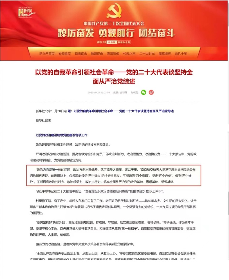 新华社:《以党的自我革命引领社会革命——党的二十大代表谈坚持全面从严治党综述》