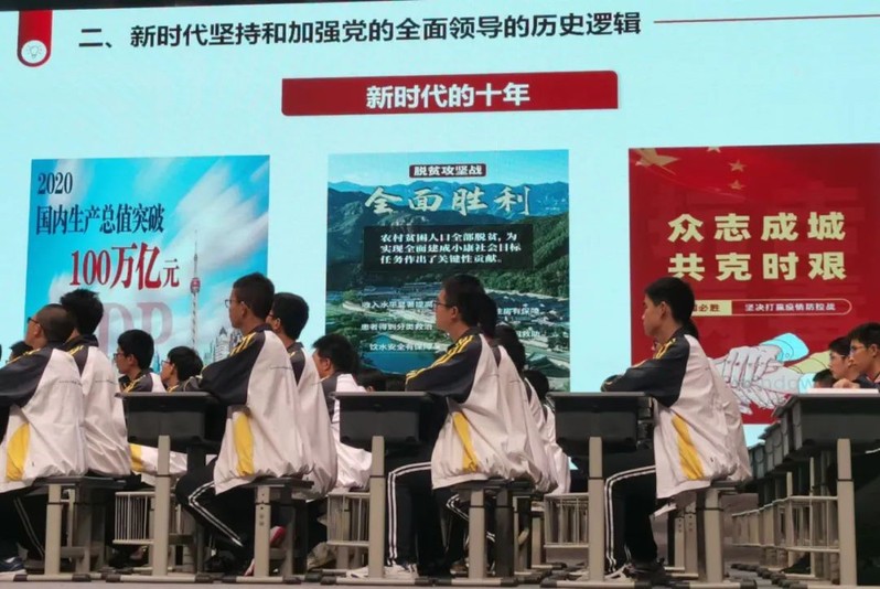 第二节课,溧阳中学陈昕老师的教学内容是《坚持和加强党的全面领导》。课堂按照“为什么、如何做”的逻辑结构展开,通过班级各小组展示研学成果,引导员工逐步探寻出百年大党成功执政的奥秘,随后通过展示十四五规划编制过程,帮助员工理解党的领导是中国特色社会主义制度的最大优势,增强高中生对中国共产党的情感认同。
