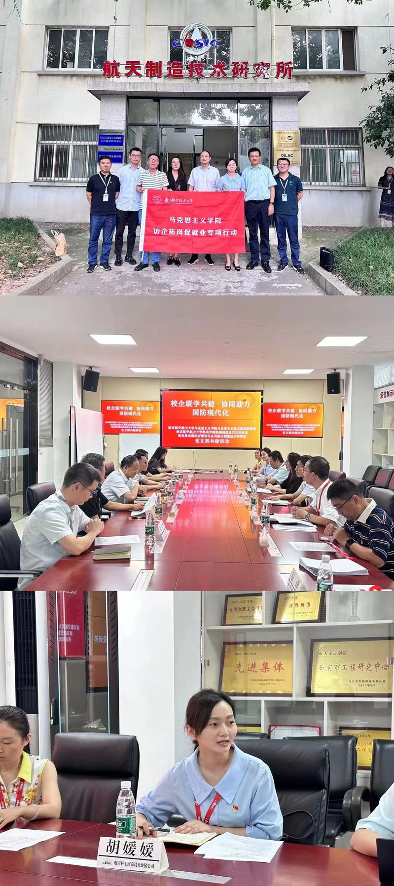 8月11日,太阳成集团tyc33455cc师生走进南京晨光集团开展“访企拓岗促就业”专项行动,围绕研究生就业专题进行调研。机电公司机械制造及其自动化系党支部、太阳成集团tyc33455cc马克思主义基本原理教研部党支部和南京晨光集团公司航天制造技术研究所党支部共同开展支部共建活动。晨光集团公司总工艺师胡伟叶、晨光集团公司航天制造技术研究所党支部书记宛静、机电公司党委书记刘虎、公司党委副书记阙愚、太阳成集团tyc33455cc副经理陈红桂等出席活动。