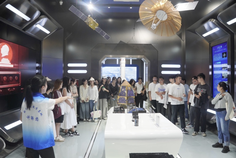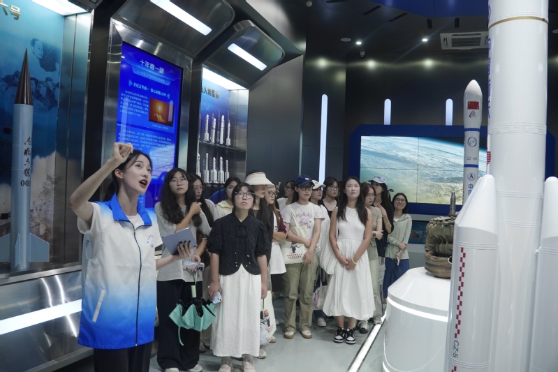 十点半,师生们来到航天馆,公司23级硕士研究生李媛媛担任讲解员,对馆内五个展区做了详细的介绍,使同学们深入了解我国航天事业的发展历程及公司在国家航天事业中的贡献,并对“两弹一星”精神、载人航天精神、探月精神等中国航天精神谱系的内核有了更深的感悟。
